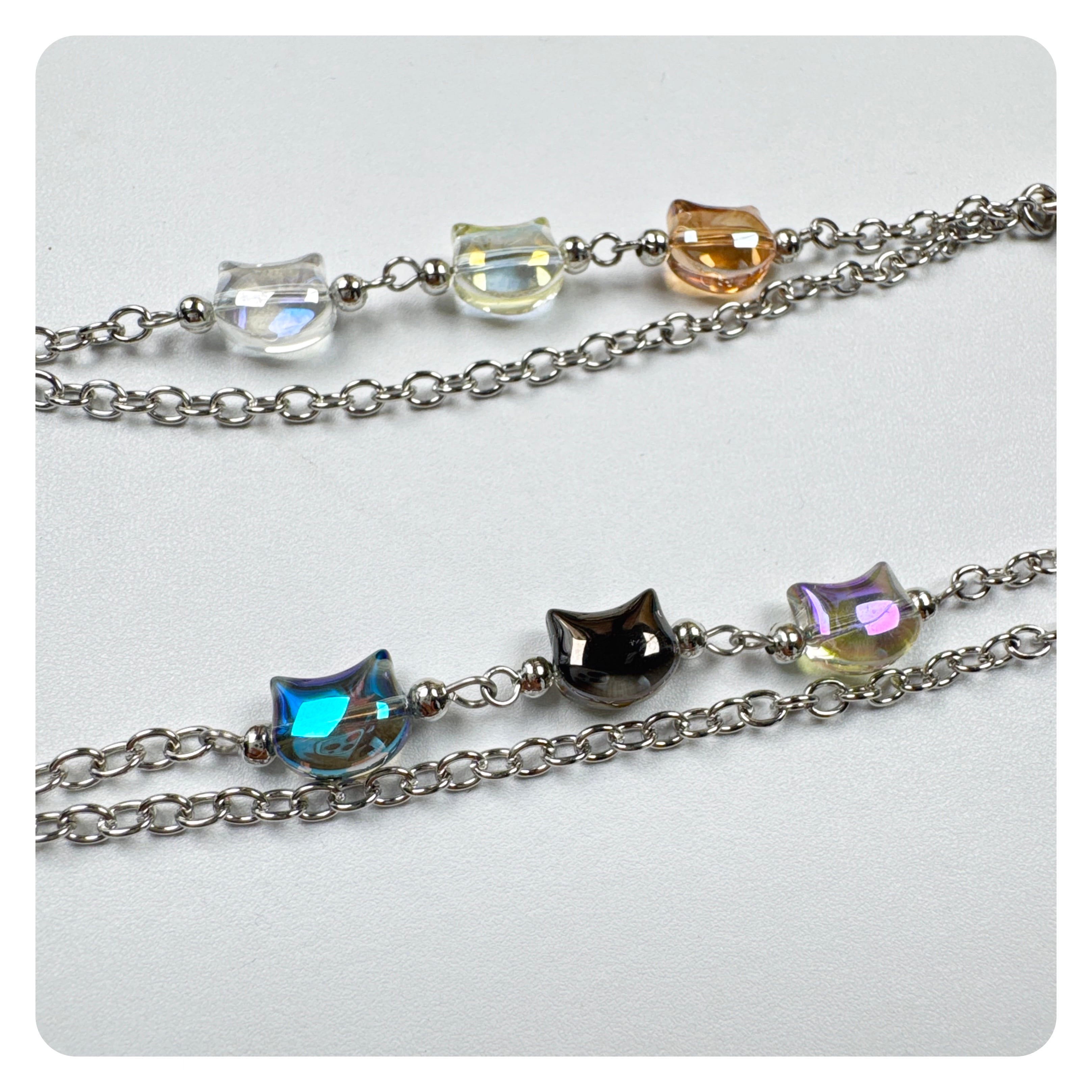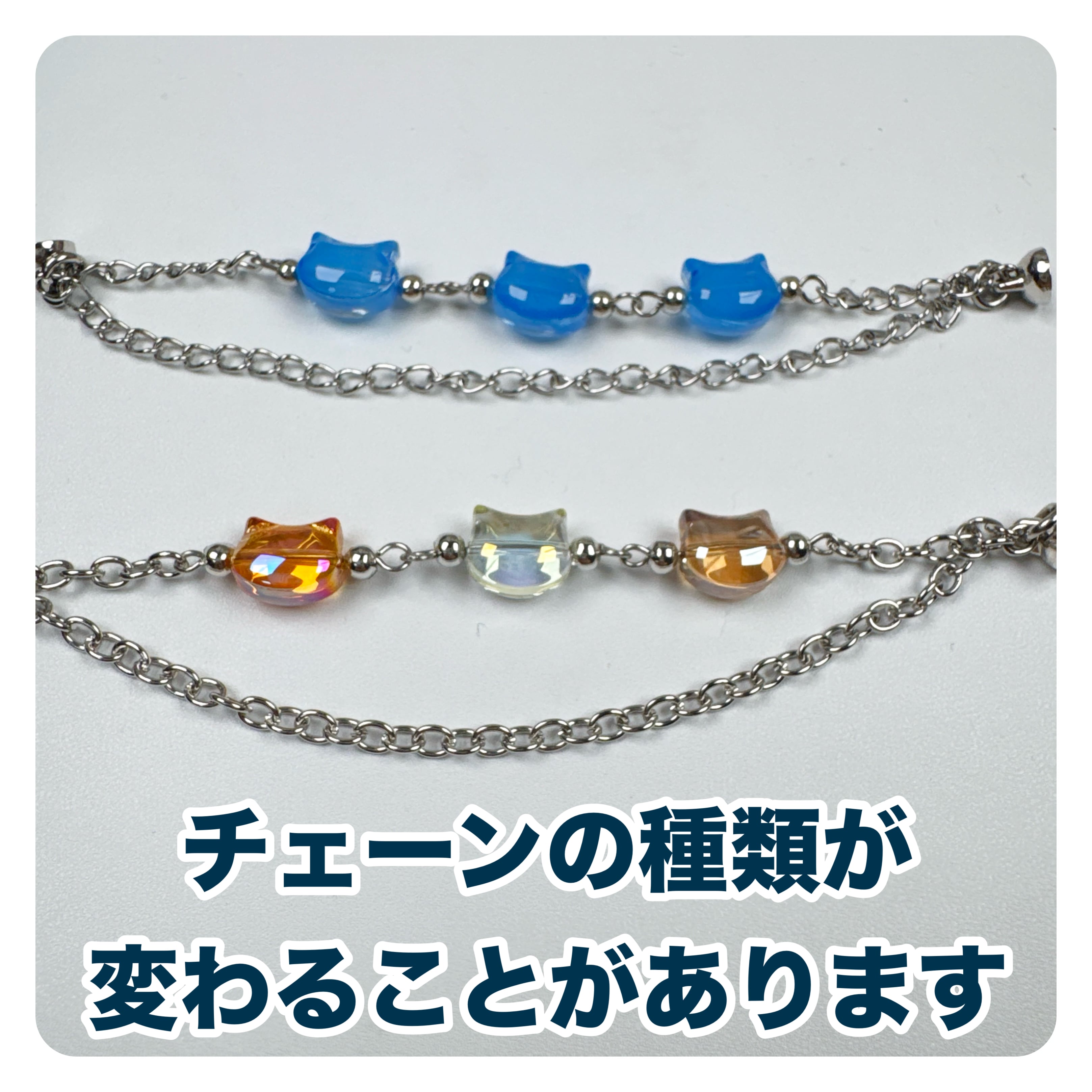 ガラスビーズの猫が3連、カラフルに組み合わせています。