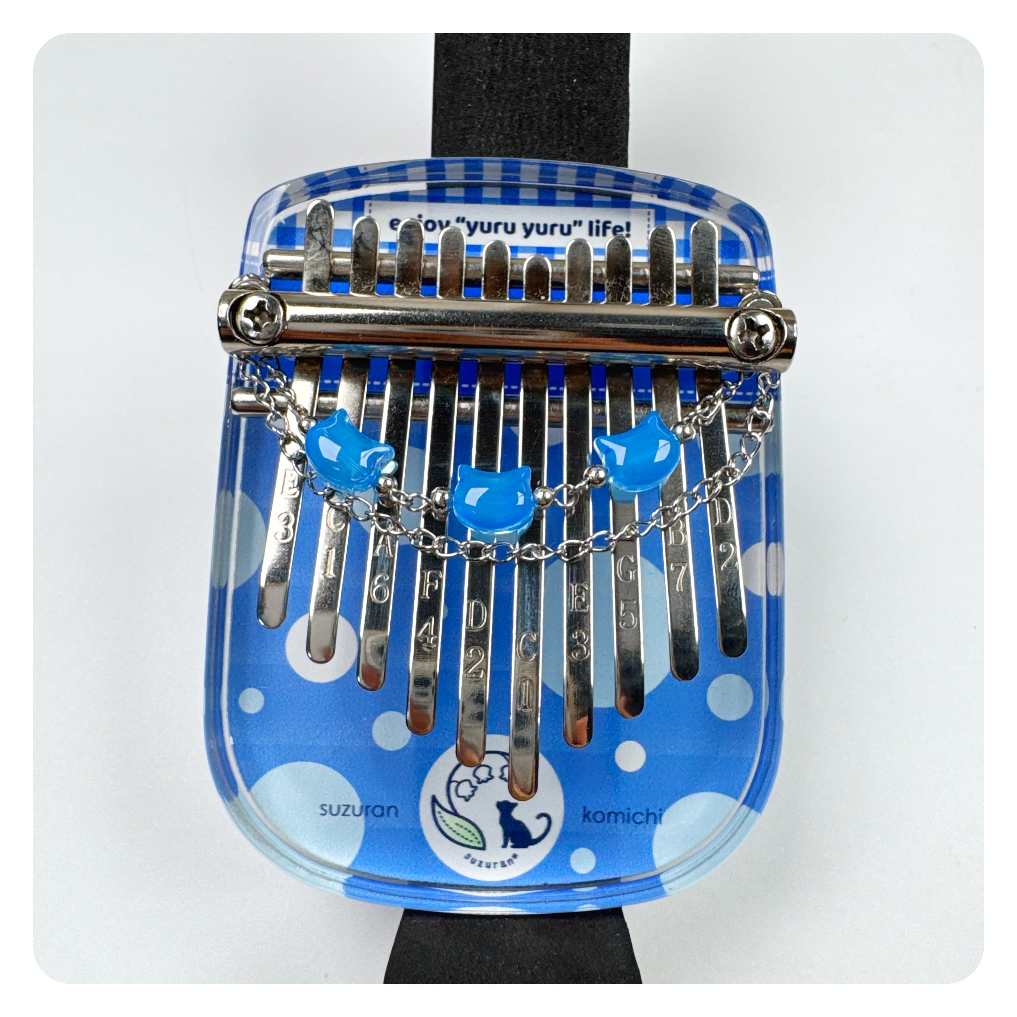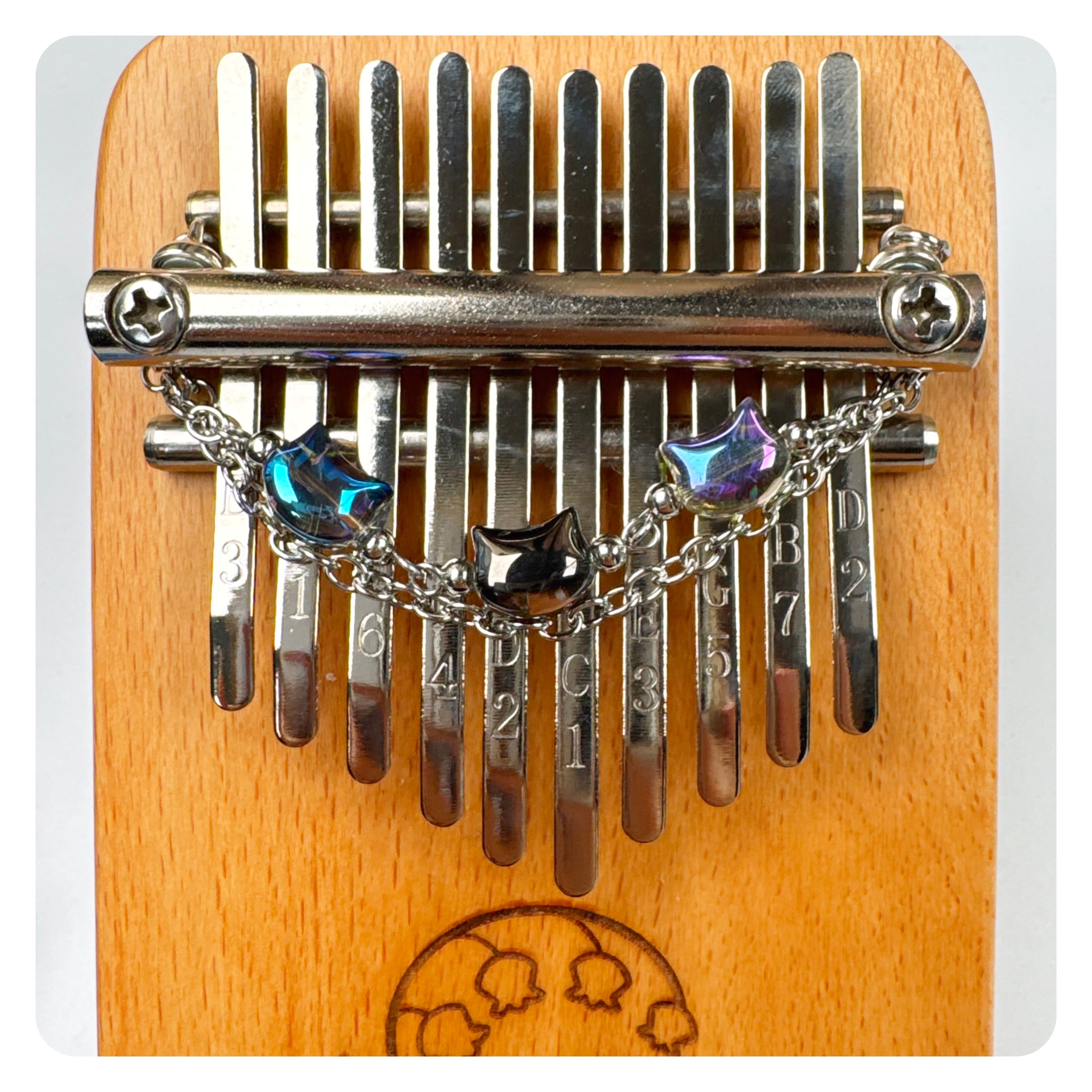 鈴蘭小道の10音カリンバの場合は、ブリッジの上の方に装着して、両脇からチェーンを引っ掛けるとちょうど良い長さになっています。