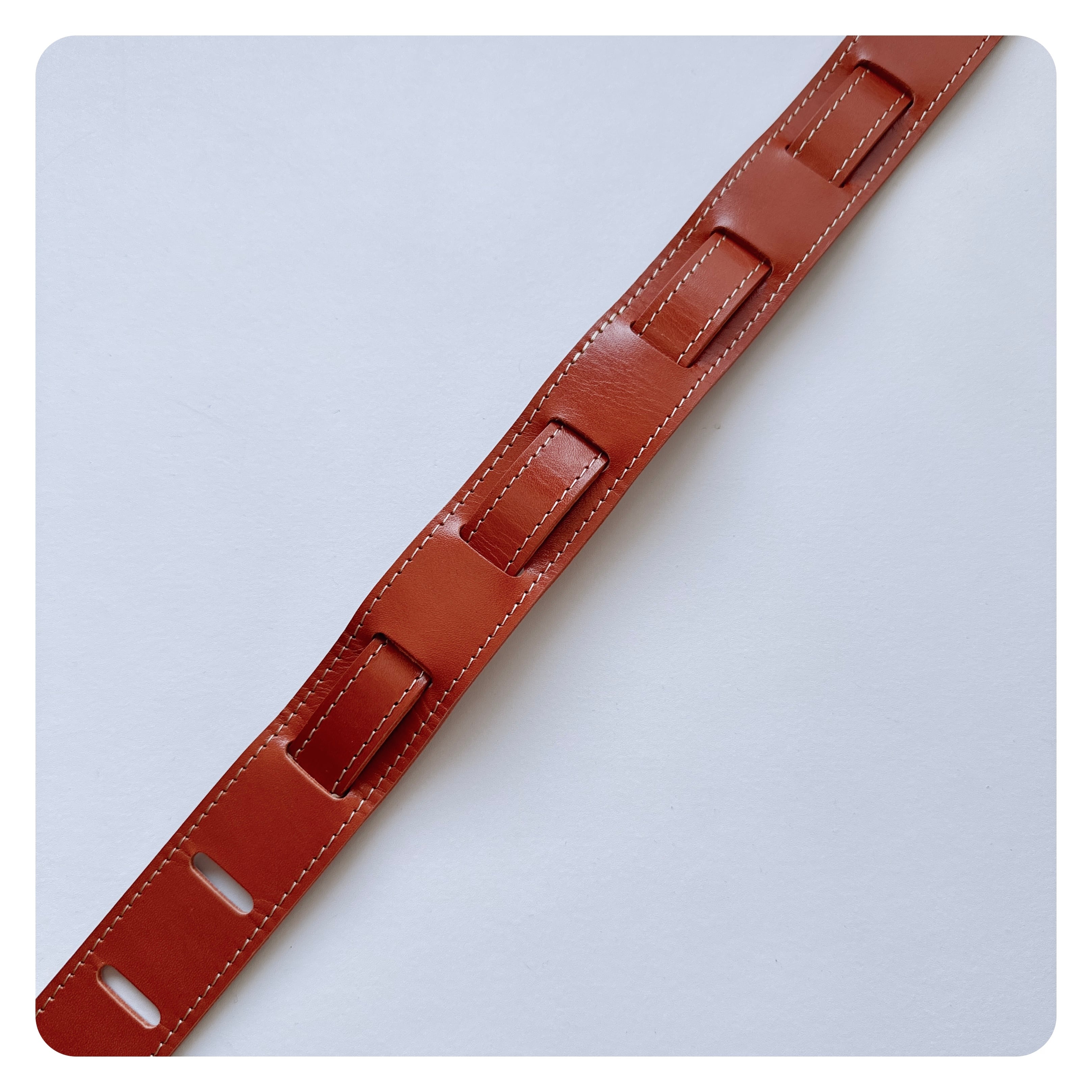 ストラップの硬さは、ハリがあるヌメ革を使用し、厚みもあるので、硬めでしっかりとしています。