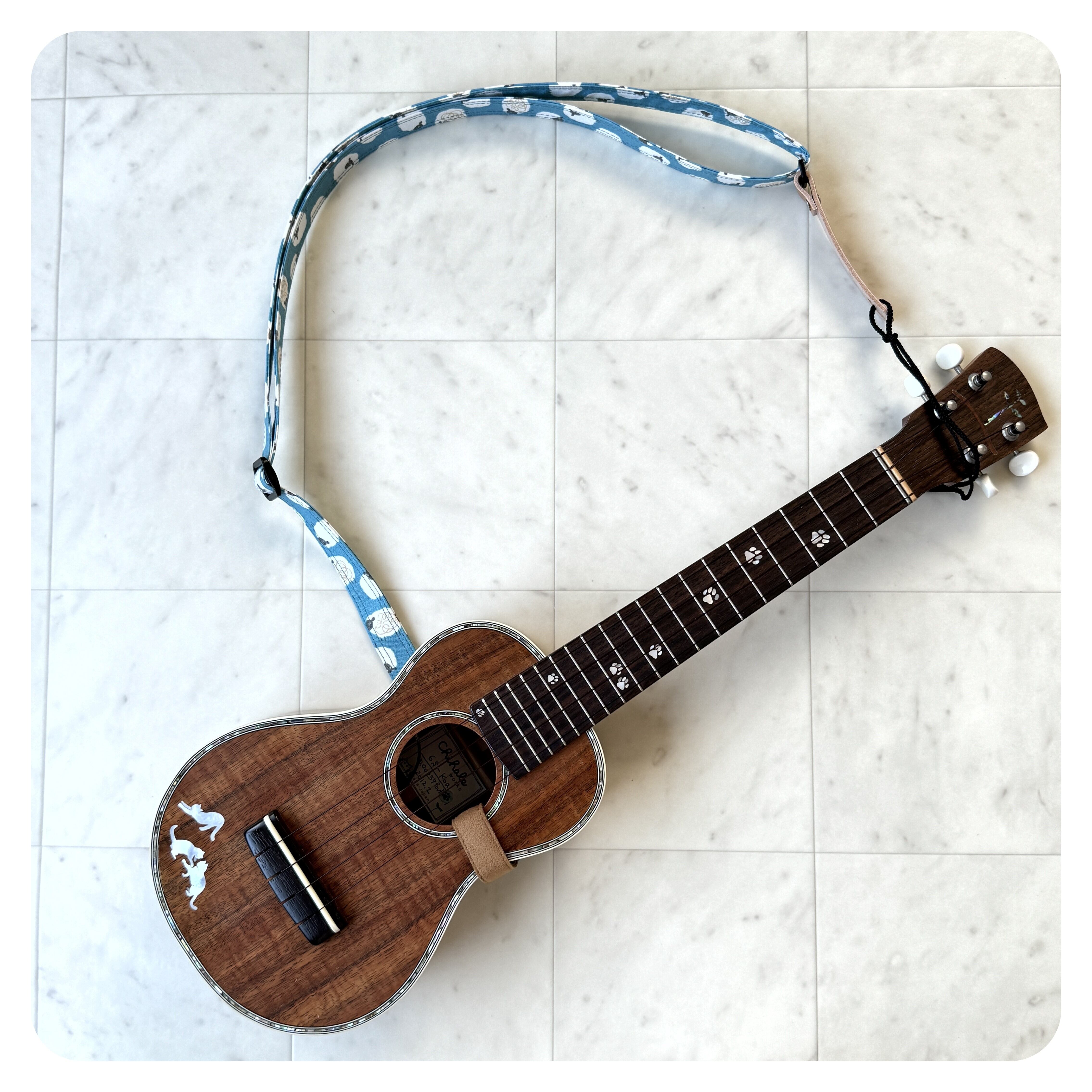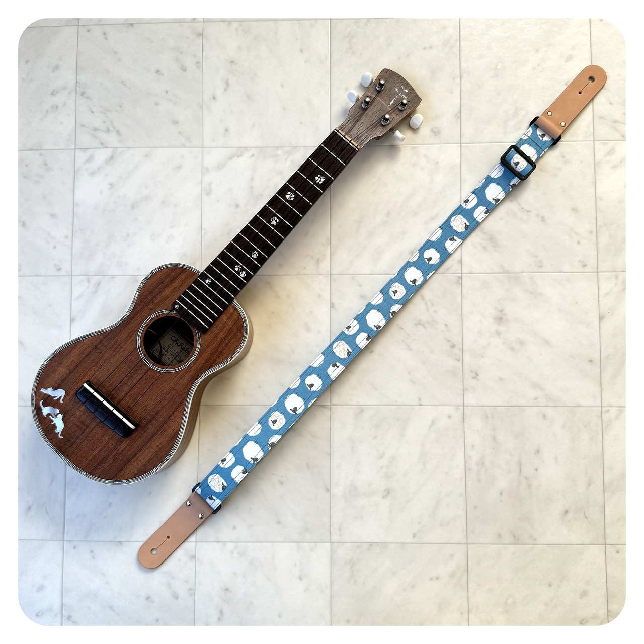 ウクレレストラップ[ふわモコひつじ]ブルー 【首の凝らないフック式・アジャスター付/ピン式】